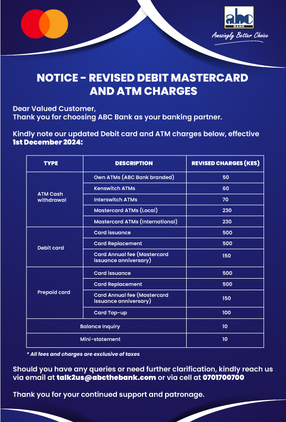 Kindly note our updated Debit card and ATM charges below, effective 1st December 2024: